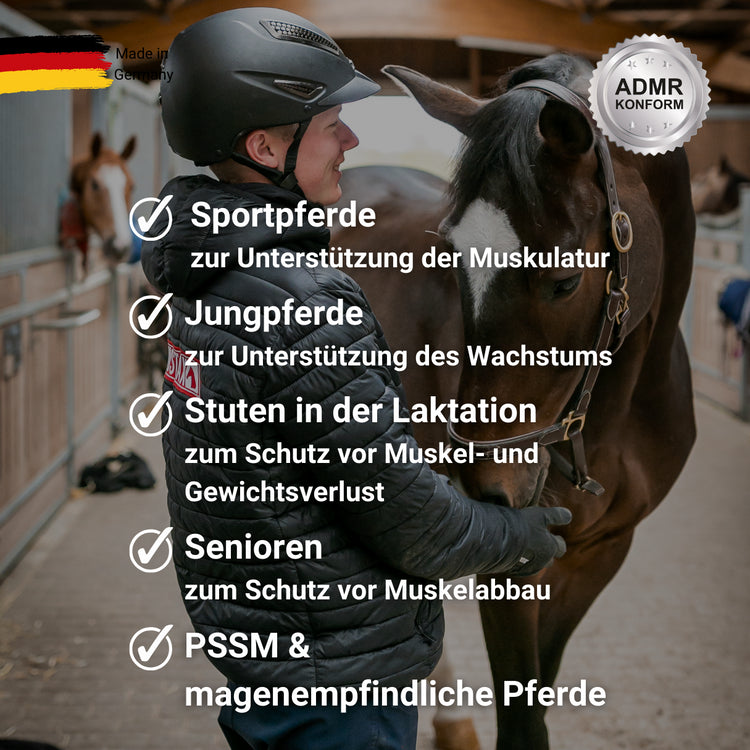 - ideal für Sportpferde, Fohlen, Jungpferde, Hengste & laktierende Stuten und unterstützt optimal deren Entwicklung, Kraft, Leistung und Erholung
