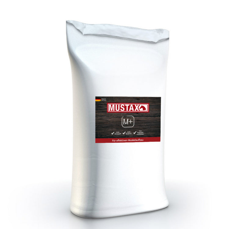 - MUSTAX M+ obsahuje obzvláště vysoké množství lehce stravitelných syrových bílkovin a esenciálních aminokyselin, které díky prášku může váš kůň skutečně rychle a efektivně přeměnit.