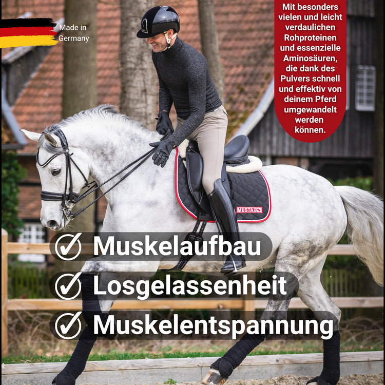 MUSTAX Muskel+ liefert optimal verfügbare, leicht verdauliche Proteine, essenzielle Aminosäuren und wichtige Vitamine, die dein Pferd direkt verwerten kann. Die kontinuierliche und gezielte Nährstoffversorgung sorgt hierbei für einen nachhaltigen Muskelaufbau, einen stabilen Muskelerhalt sowie eine gesunde Regeneration.